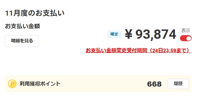 2025年10月の楽天カードでの生活費は43,874円です。5万はNISA積立の引落しがありますので総楽天カード引落は93,874円になります。